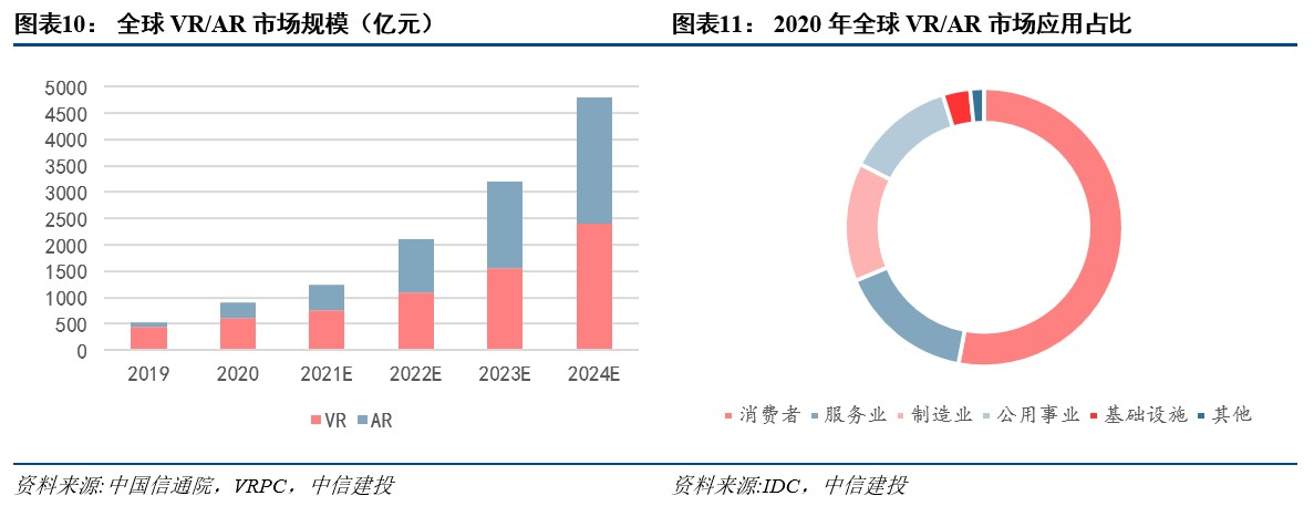 近年来,随着VR/AR技术的突破发展以及消费需求的强劲增长,VR/AR行业提速明显,迎来了新的拐点。2020年以来,VR/AR终端设备的出货量明显加速增长。研机构DC数据显示,未来三年VR/AR行业复合增长率超过80%。据测算,全球 VR/AR 市场规模接近千亿,AR 与内容应用成为首要增长点,预计 2024 年将达到近 5000 亿元。此外,卷土重来的VR/AR赛道热度同样投射到资本市场的投融资规模上。据了解,2020年 VR/AR 投融资规模达到 244 亿元,投融资并购发生 219 起,实现连续三年上涨。其中,在2020 年和 2019 年的融资并购案例中,AR 眼镜领域的并购金额居于首位。